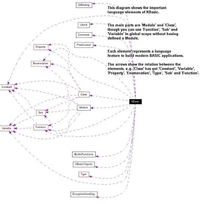 Of course like other programming languages, KBasic comes with commands for control flow, conversion/casts, error handling, events and library functions like for gui, input or output, maths and so on. See the language reference for more. But besides this you should be familiar with the following main parts.