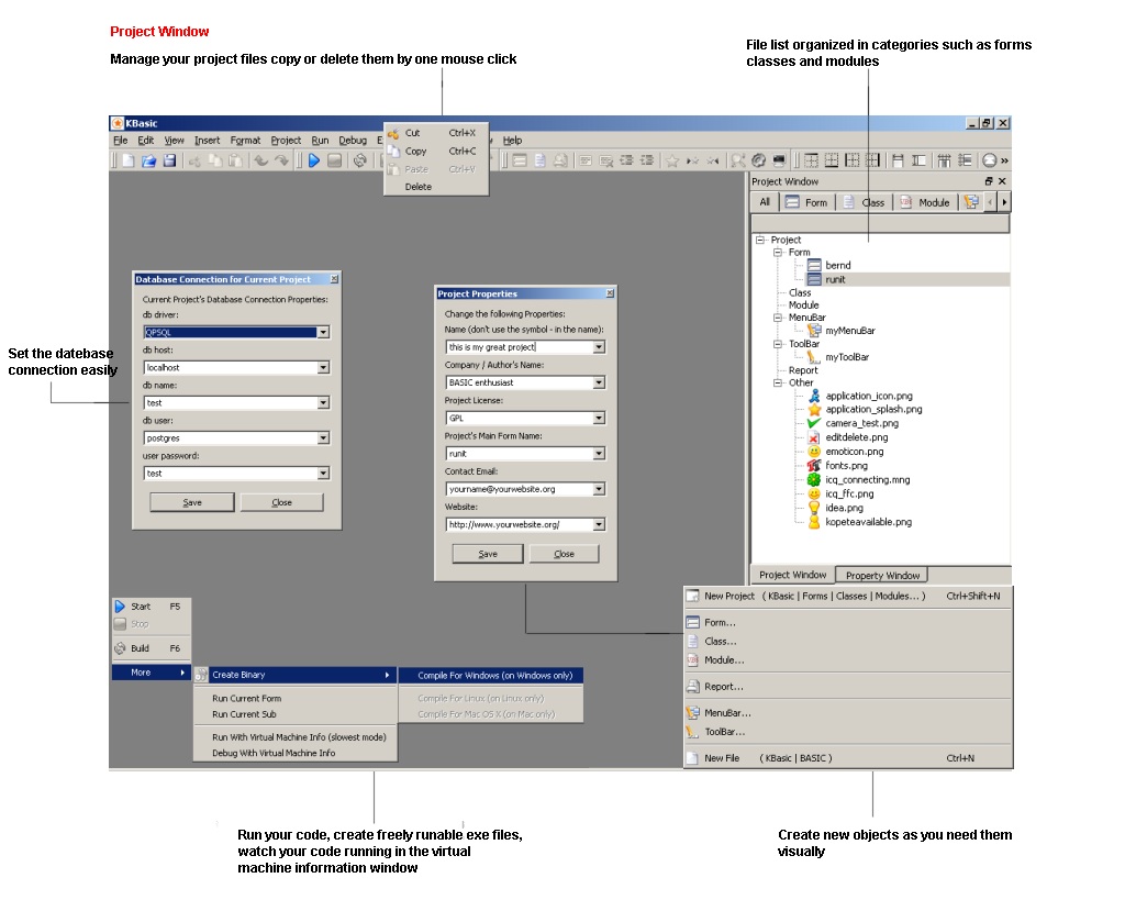 KBasic is an open source project backed by years of continual development. It comes with Java™-like object orientation and backward support for VB6 and QBasic®, as it is 100% syntax compatible, but it is not a VB6 or VB.NET™ clone! Though it comes with support for VB.NET™ syntax, functions and similar objects and classes as well. KBasic combines the expressive power of Object-Oriented languages like C++ with the familiarity and ease of use of VB6. It allows developers with an installed base of VB6 applications to start developing for a mixed Windows®, Mac® OS X and Linux® environment without having to face a steep learning curve: KBasic uses the familiar visual design paradigm and has a full implementation of the BASIC language.